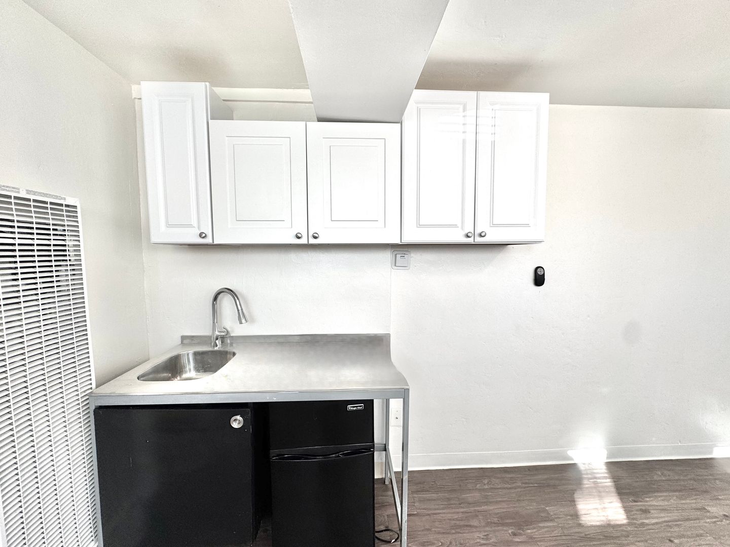- Kitchenette with stainless steel sink, electric hot plate, mini fridge, and toaster oven