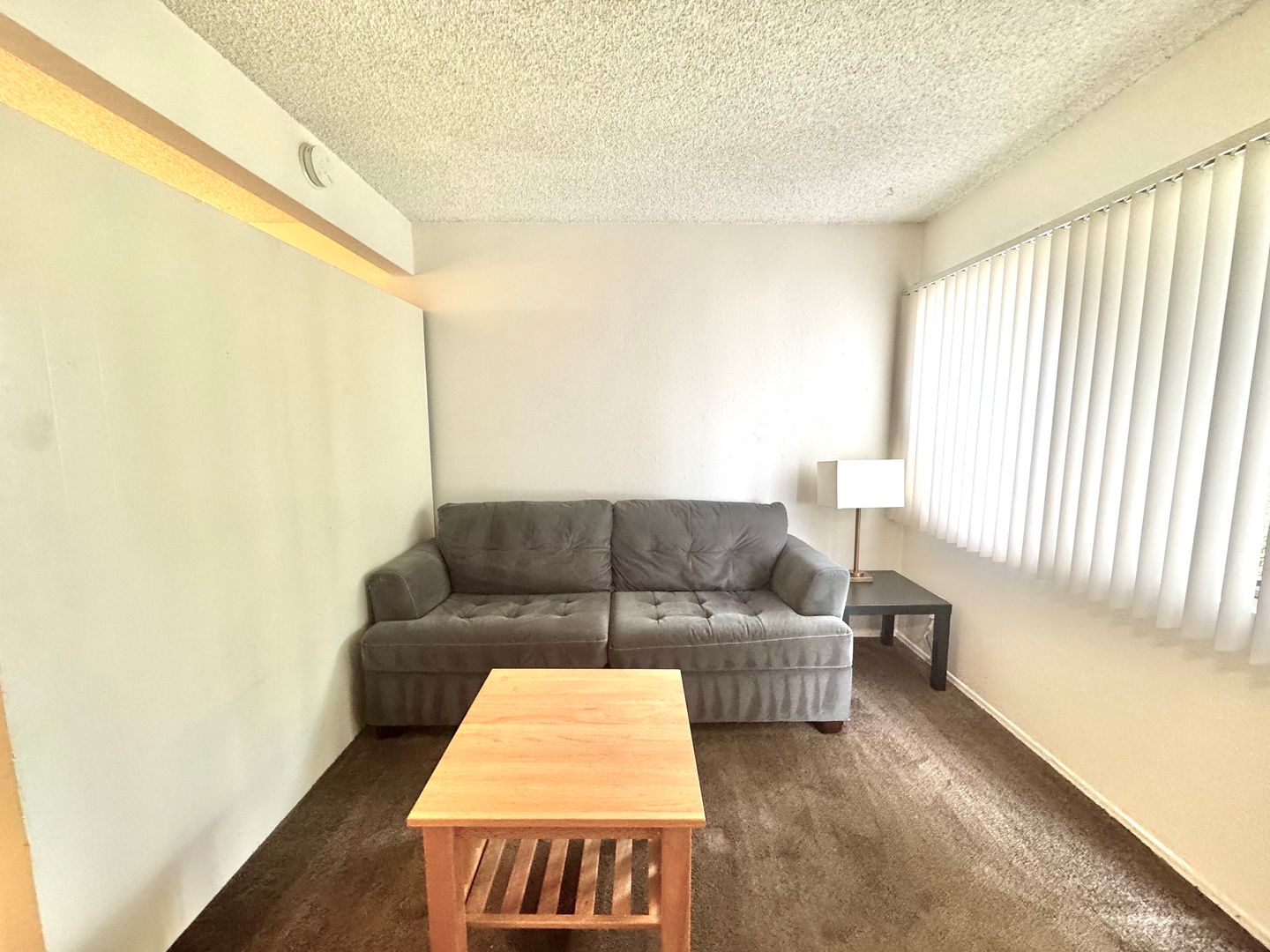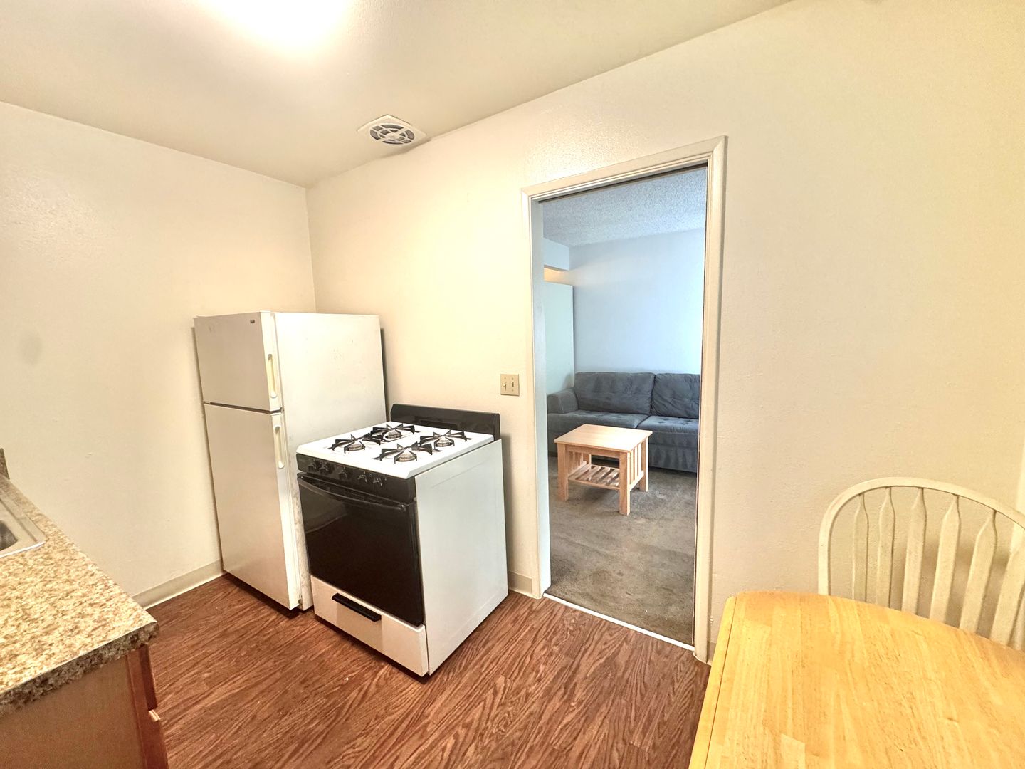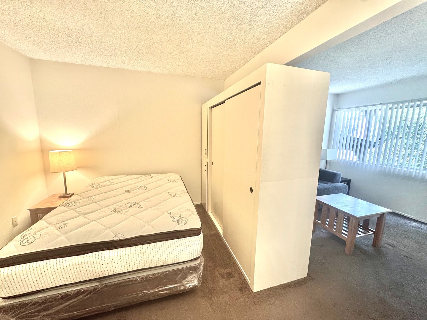 - Furnishings include couch, coffee table, kitchen table, full size bed, and dresser