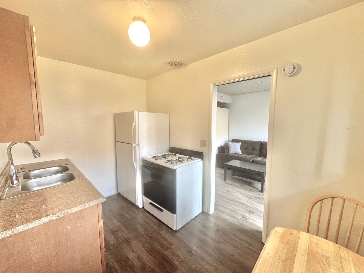 - Furnishings include couch, coffee table, kitchen table, full size bed, and dresser