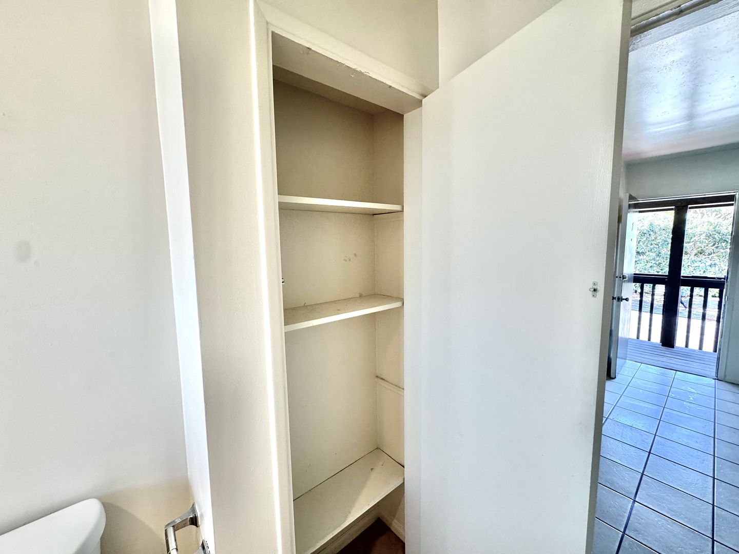 - Vanity and linen storage in bathroom