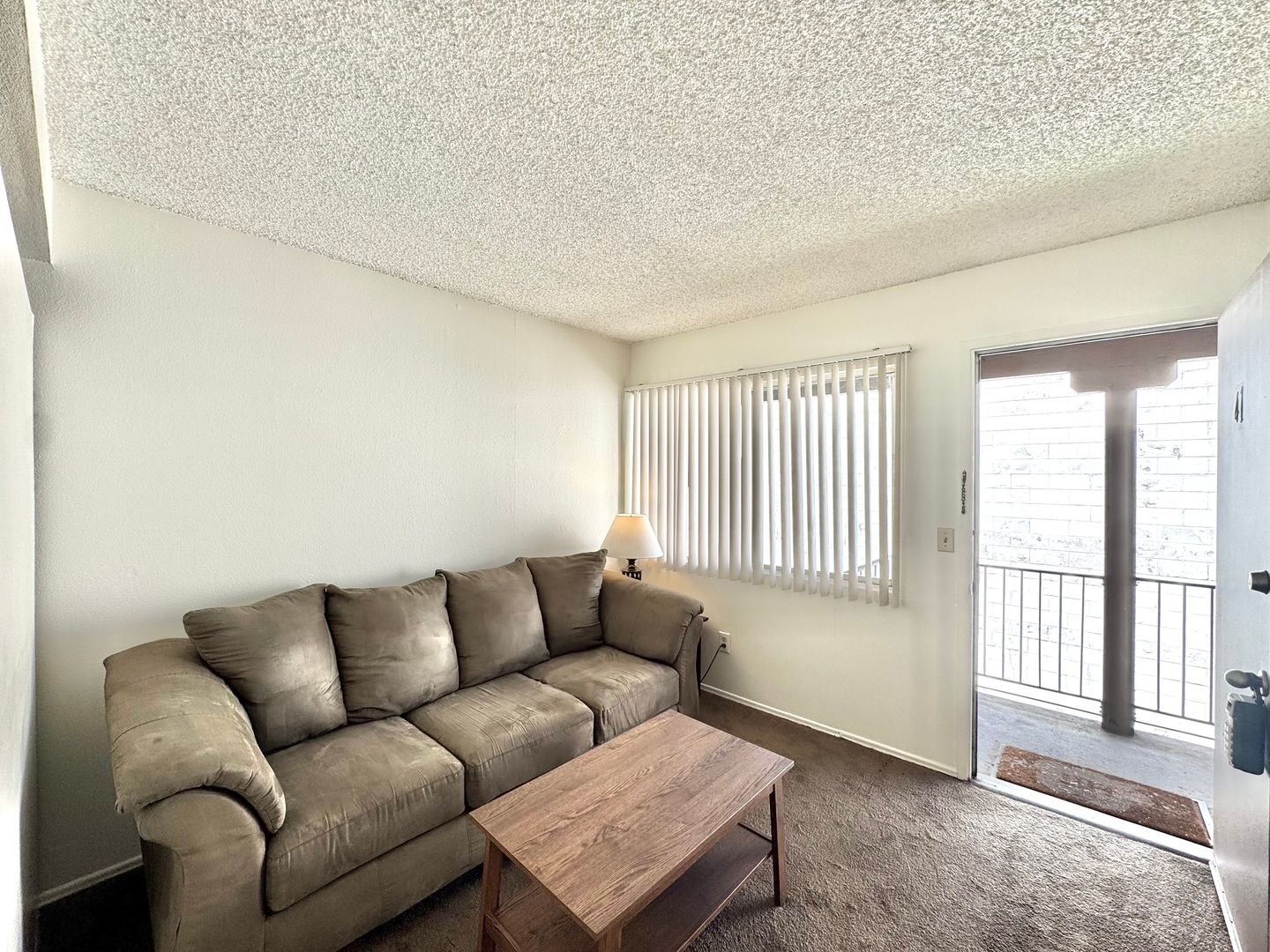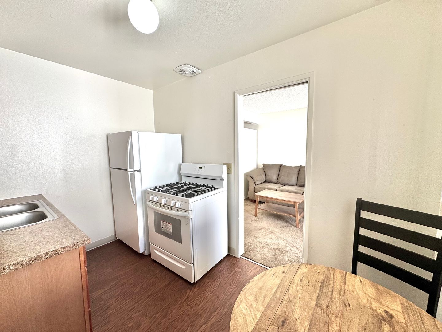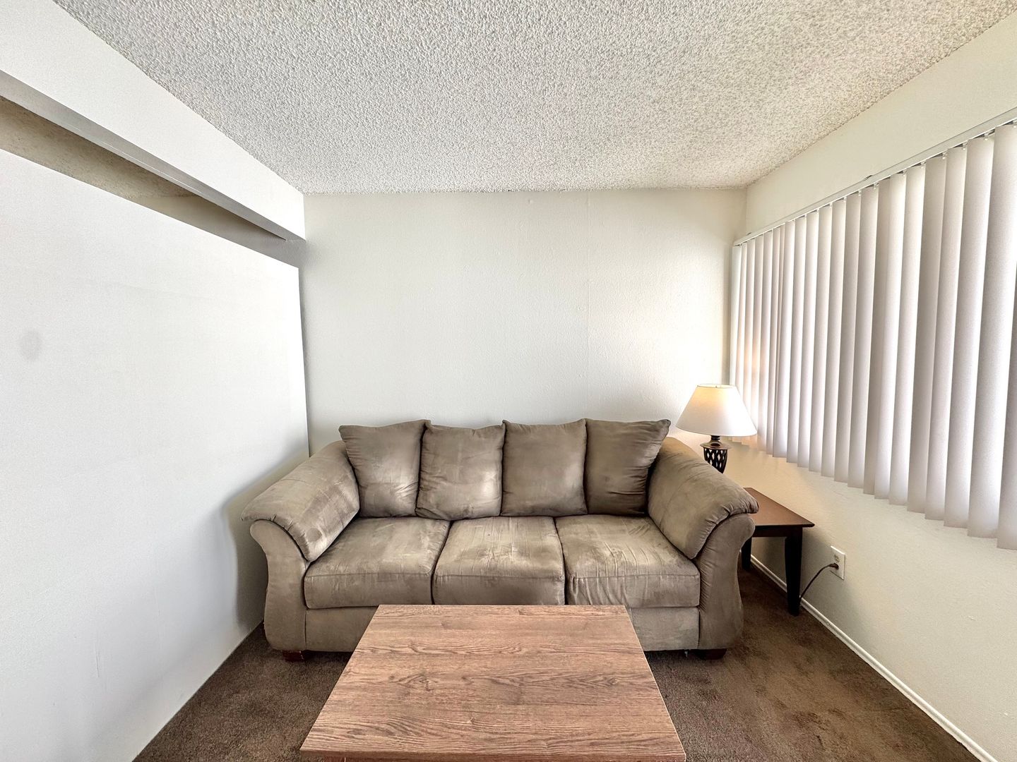 - Furnishings include couch, coffee table, kitchen table, full size bed, and dresser